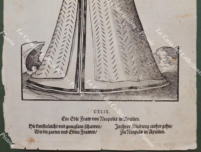 Anno 1577. FOEMINA NOBILIS NEAPOLITANA (Donna nobile di Napoli). Rara xilografia (cm 20,2x31,6) dall'opera di Hans Weigel "HABITUS PRAECIPUORUM POPULORUM TAM VIRORUM QUAM FOEMINARUM". Conservazione buona eccetto piccole imperfezioni al margine del foglio. (Rif.F7557)
