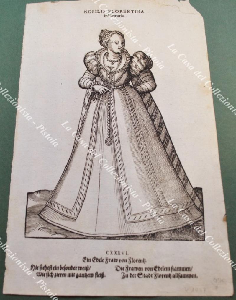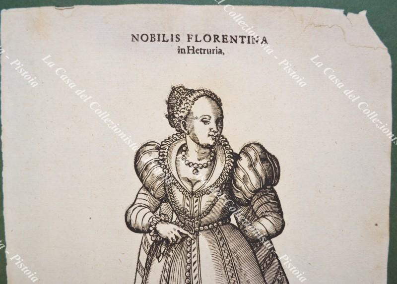 Anno 1577. NOBILIS FLORENTINA in HETRURIA (Donna nobile di Firenze). Rara xilografia (cm 20,2x31,6) dall'opera di Hans Weigel "HABITUS PRAECIPUORUM POPULORUM TAM VIRORUM QUAM FOEMINARUM" edita a Norimberga nel 1577. Conservazione buona, piccola mancanza di carta all'angolo superiore destro. (Rif.F7555)