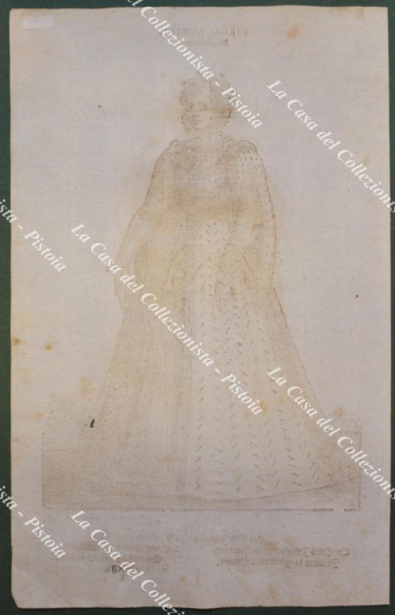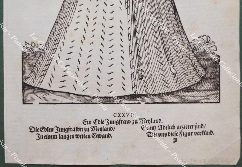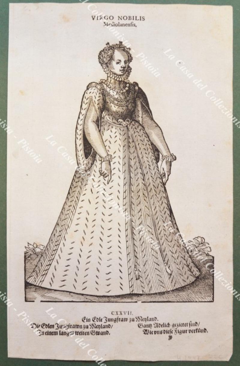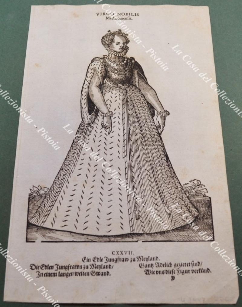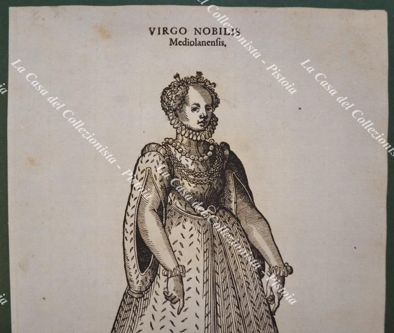 Anno 1577. VIRGO NOBILIS Mediolanensis (Donzella nobile di Milano). Rara xilografia (cm 20,2x31,6) dall'opera di Hans Weigel "HABITUS PRAECIPUORUM POPULORUM TAM VIRORUM QUAM FOEMINARUM", edita a Norimberga nel 1577. Ottima conservazione. (Rif.F7556)