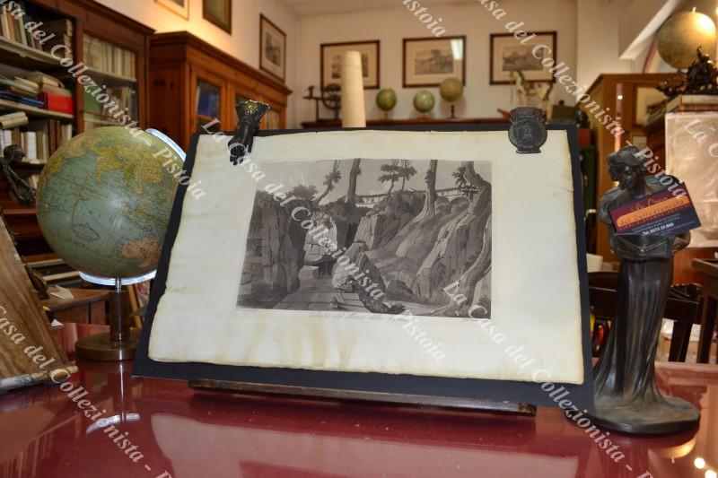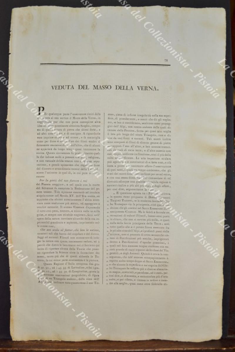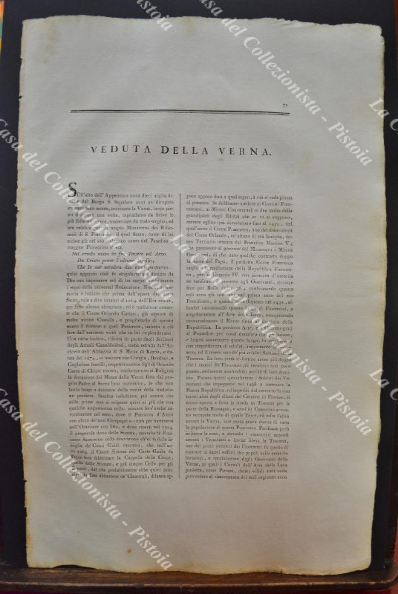 Arezzo. VEDUTA DELLA VERNA e VEDUTA DEL MASSO DELLA VERNA. Due grandi incisioni all'acquatinta dall'opera di Antonio Terreni, anno 1801 - 1803. Incisioni all'acquatinta, originali dell'epoca, disegnate da Antonio Terreni e incise da Giuseppe Pera. Misurano cadauna mm 340x230 (ai margini mm 560x355). Tratte dall'opera "Viaggio Pittorico della Toscana" edita in Firenze tra il 1801 ed il 1803 da Giuseppe Tofani. Lievi ingiallimenti e bruniture laterali, unito il testo descrittivo. (Rif.B3800)
