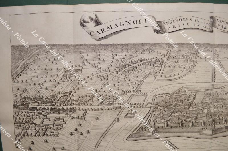 Piemonte, Carmagnola. CARMAGNOLI INGENOMEN IN 1691 DOOR SYN H.T. DEN P.R. EUGENIUS VAN SAVOIE *** CARMAGNOLI PRISE EN 1691 PAR S.A.S. EUGENE DE SAVOY". Jan Van Huchtenburg, Aia, circa 1725. Splendida grande veduta a volo d'uccello della città fortificata di Carmagnola e dei borghi vicini; misura mm 823x494 (ai margini 885x535). Perfetta conservazione. (Rif.F7485)