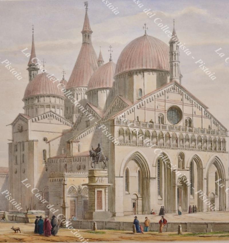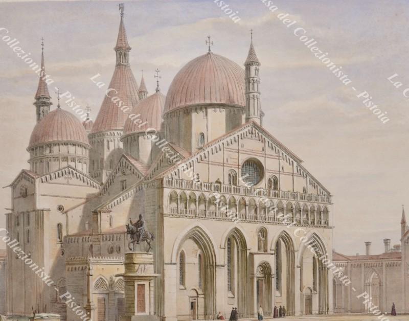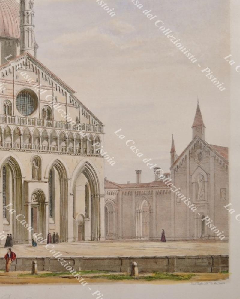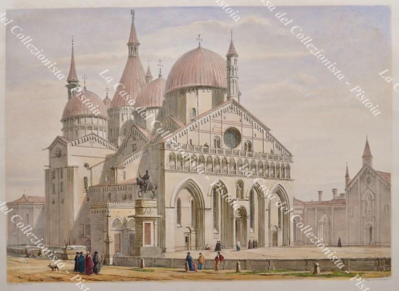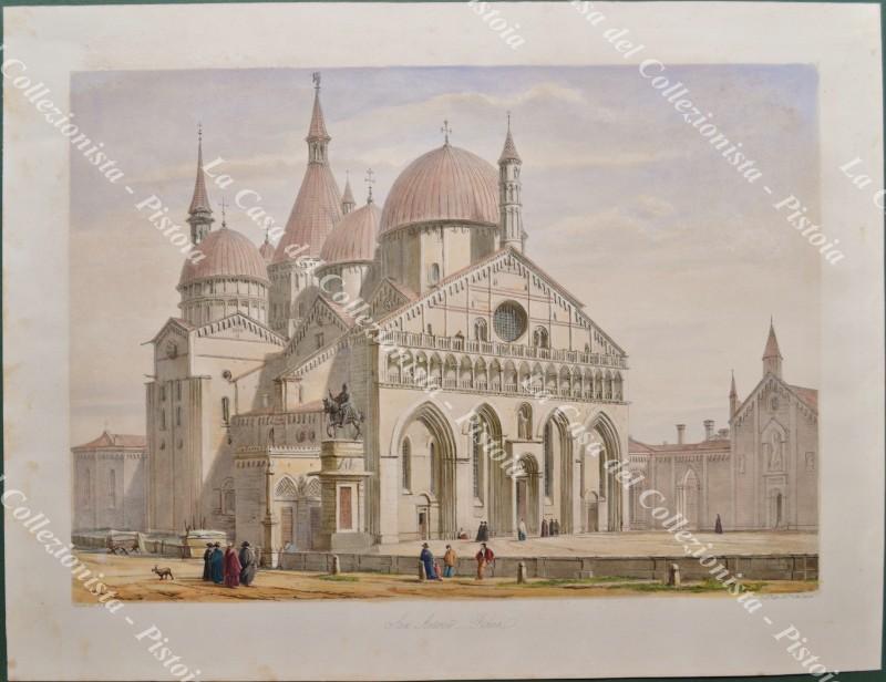 VENETO - PADOVA. SAN ANTONIO - PADUA. Animata veduta esterna della basilica. Litografia di George Moore su disegno di D. Quaglio tratta da “The ecclesiastical architecture of Italy” di Henry Gally Knight, opera edita a Londra nel 1844. Mm 395x280 (ai margini mm 465x355). Finemente acquarellata, ottima conservazione, minimi ingiallimenti laterali; a retro traccia di adesivo per precedente montaggio. (Rif.F3021-326/75)