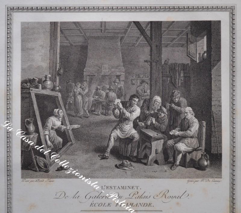 ACQUAFORTE '700. "L’ESTAMINE’". Interno di osteria con primo piano di giocatori di carte. Splendida incisione assai decorativa tratta da La Galerie du Palais Royale edita nel 1786. Finissima scena racchiusa in cornice tipografica; nella metà inferiore descrizione e storia del dipinto con cenni bibliografici del pittore. Misura ai margini cm 33x50 e si trova in ottima conservazione, eccetto alcuni lievi ingiallimenti. (Rif.D1854 - 321/65)