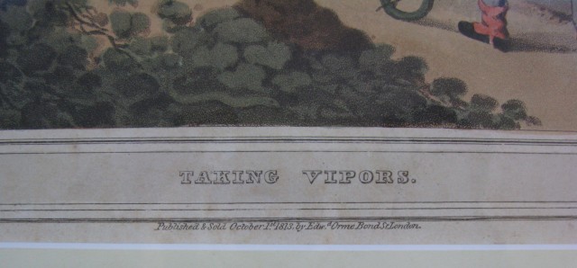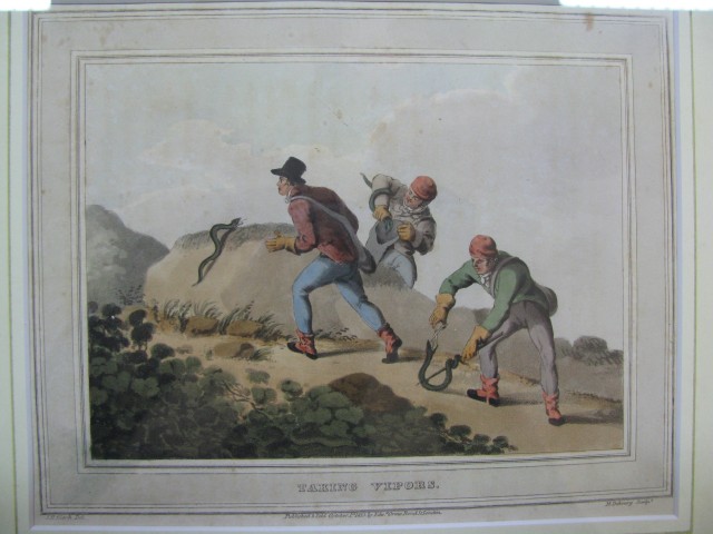 Bella e decorativa scena di caccia alla vipera pubblicata da Edward Orme a Londra nel 1813. Incisione realizzata su rame con la tecnica dell'acquatinta e splendidamente acquarellata all'epoca. La parte incisa misura cm 18,2x13,1, mentre con cornice cm 42x37,5. La cornice, entro cui la stampa viene presentata, è stata lavorata a mano (stesura a caldo della colla di coniglio, ammanitura con gesso di Bologna, stesura del bolo, lucidatura con gommalacca e finitura a cera. Doratura a foglia con missione). Passepartout in pastalegno decorato all'acquarello. La stampa è originale dell'epoca, si trova in ottima conservazione e viene accompagnata da certificato di autenticità . (Rif.B2022)