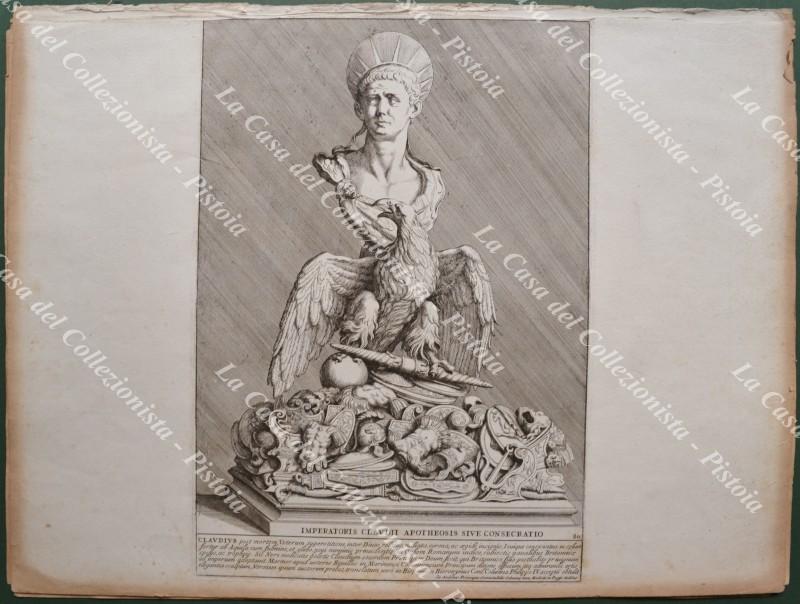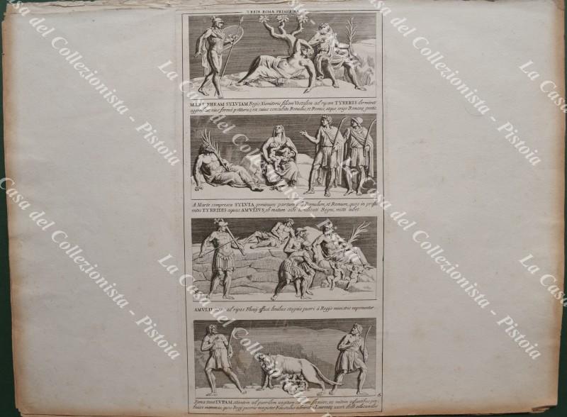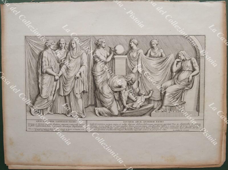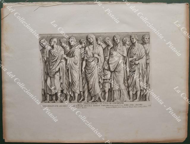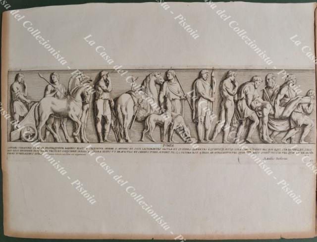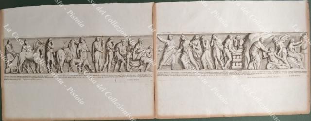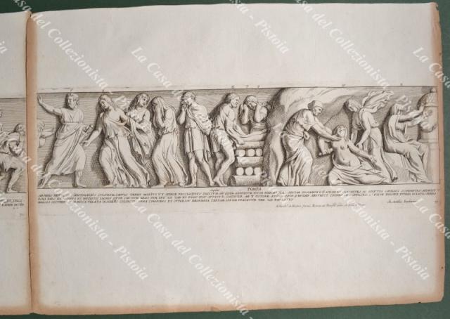 PIETRO SANTI BARTOLI (1635-1700). Pittore e incisore italiano. GIOVANNI GIACOMO DE ROSSI o in latino IONNES IACOBUS DE RUBEIS (1627-1691). Stampatore ed editore attivo a Roma del 1648 alla morte. INSIEME DI 8 TAVOLE incise all'acquaforte tratte dall'opera "Admiranda Romanarum antiquitatum ac veteris sculptura vestigia..." edita nel 1693. Stampate su carta vergellata mm 480x350. Due (le pagine 70 e 71) formano un unica immagine. Le tavole sono brunite ai margini. (Rif.F2194)