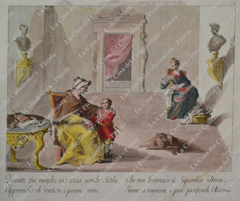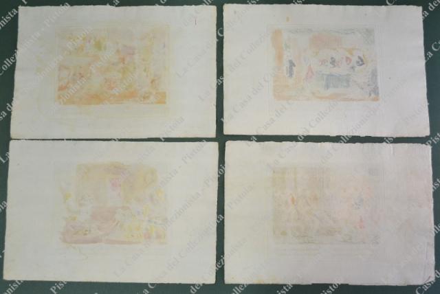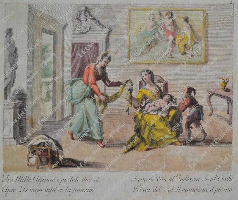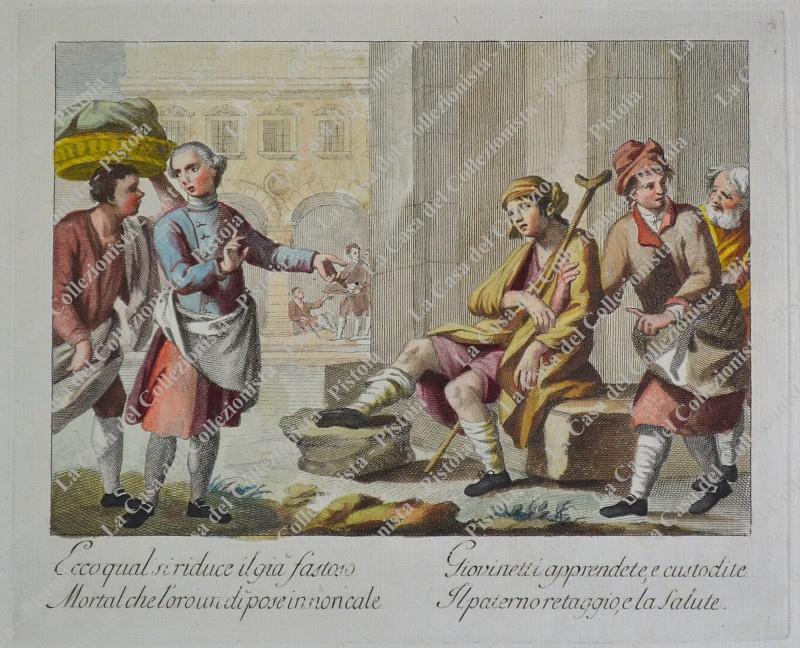 PROVERBI SETTECENTESCHI. Quattro tavole ciascuna di mm 440x330 incise all’acquaforte e colorate all’epoca. Impresse su carta vergellata, sono databili alla seconda metà del 1700. Quattro belle scene animate con didascalia alla base. (Rif.D5160 - 121/73)