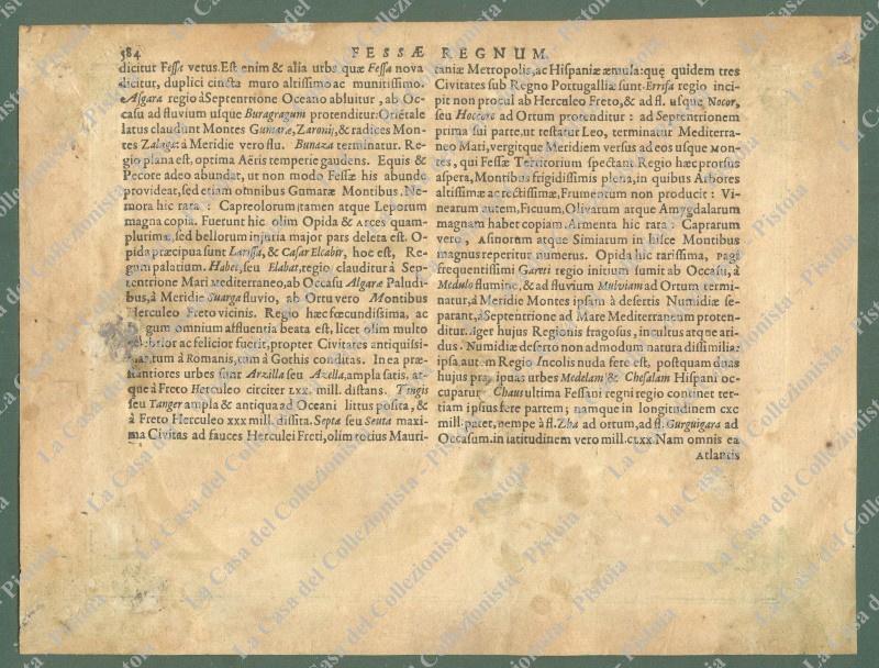 AFRICA, MAROCCO. FESSAE REGNUM. Cartina colorata all’epoca tratta dall’Atlas Minor di Jodoco Ondio, circa 1600. Mm 190x147 (ai margini 230x174). Lievi difetti a retro (assottigliamenti) per precedente montaggio. (Rif.D5286 - 314/69)