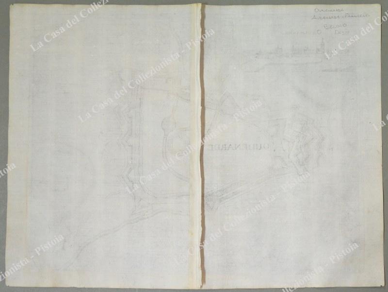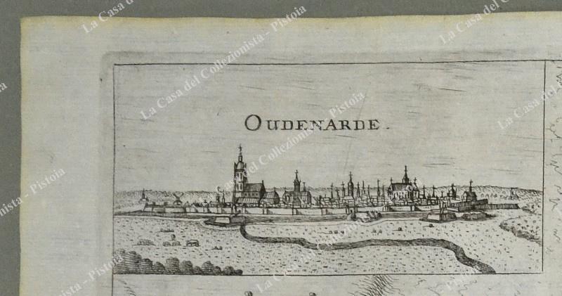 Pianta topografica della città di "Oudenarde". Incisione realizzata con la tecnica dell'acquaforte tratta da "Teatro del Belgio o sia descritione delle diecisette provincie del medesimo; Con le Piante delle Città , e Fortezze Principali; da chi al presente possesse; come, in qual modo, & in qual tempo acquistate. Aggiontovi un Succinto racconto di quanto è occorso dalla mossa d'armi del Re Christianissimo contro gli Stati Generali delle Provincie Unite fin' al fine del 1672. Descritta dal Conte Galeazzo Gualdo Priorato", opera stampata in Francoforte nel 1683. Misura cm 39x30 (ai margini cm 44,8x33,6). Buona conservazione, qualche leggera brunitura. (Rif.D6987)