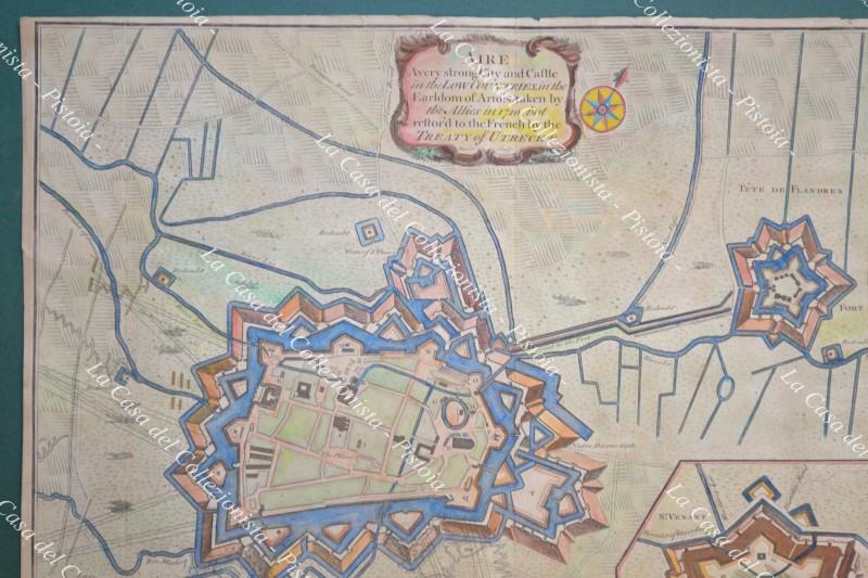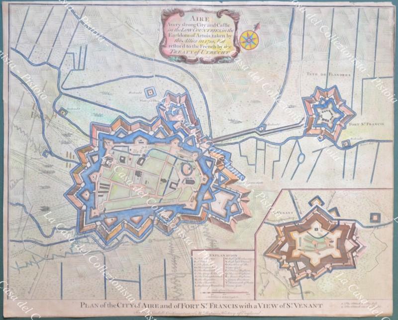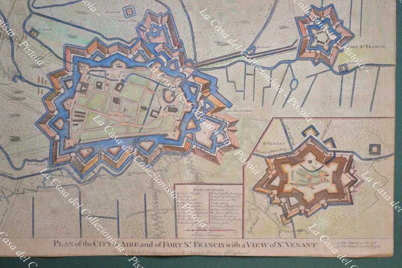 FRANCIA - FRANCE. Plan of the city of Aire and of forte St. Francis with a view of St. Venant. Acquaforte tratta dall'opera di Nicolas Tindal, anno 1745. Mm 490x400, colorata all'epoca. Buona conservazione. (Rif.D8299)