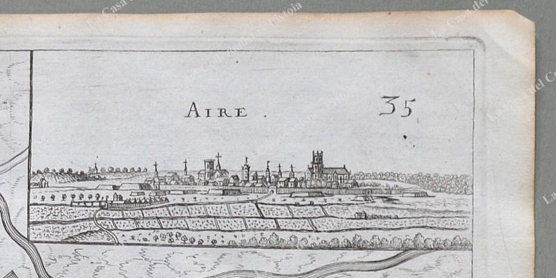 Pianta topografica della città di "Aire". Incisione realizzata con la tecnica dell'acquaforte tratta da "Teatro del Belgio o sia descritione delle diecisette provincie del medesimo; Con le Piante delle Città , e Fortezze Principali; da chi al presente possesse; come, in qual modo, & in qual tempo acquistate. Aggiontovi un Succinto racconto di quanto è occorso dalla mossa d'armi del Re Christianissimo contro gli Stati Generali delle Provincie Unite fin' al fine del 1672. Descritta dal Conte Galeazzo Gualdo Priorato", opera stampata in Francoforte nel 1683. Misura cm 40,8x30,6 (ai margini cm 45,2x33,6). Qualche lieve brunitura. Due segnetti di tarlo al margine bianco inferiore centrale, che non interessano la parte incisa. (Rif.D7000)