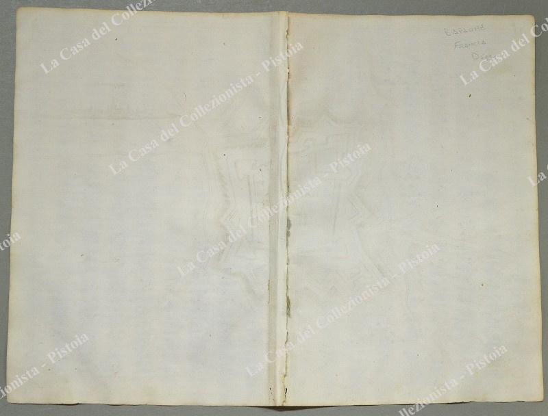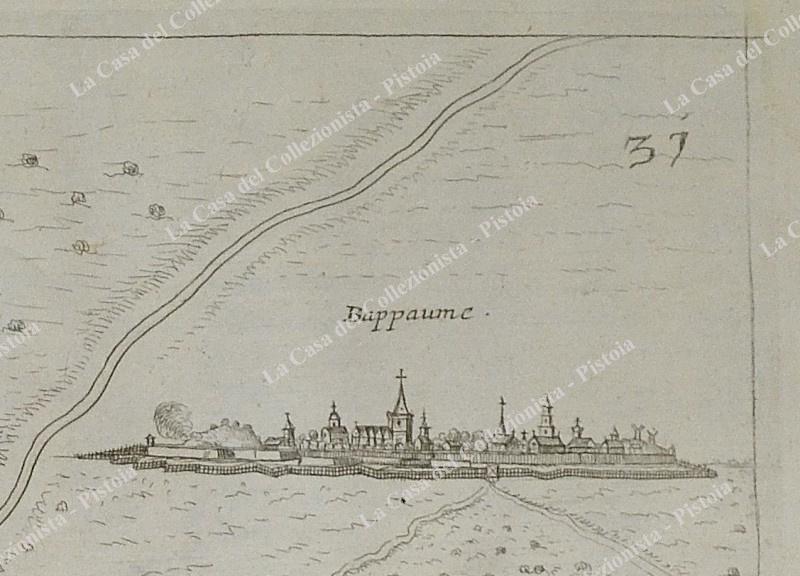 Pianta topografica della città di "Bappume". Incisione realizzata con la tecnica dell'acquaforte tratta da "Teatro del Belgio o sia descritione delle diecisette provincie del medesimo; Con le Piante delle Città , e Fortezze Principali; da chi al presente possesse; come, in qual modo, & in qual tempo acquistate. Aggiontovi un Succinto racconto di quanto è occorso dalla mossa d'armi del Re Christianissimo contro gli Stati Generali delle Provincie Unite fin' al fine del 1672. Descritta dal Conte Galeazzo Gualdo Priorato", opera stampata in Francoforte nel 1683. Misura cm 41,2x29,5 (ai margini cm 45,2x33,6). leggere bruniture. Due segnetti di tarlo al margine bianco inferiore, che non interessano la parte incisa. (Rif.D6996)