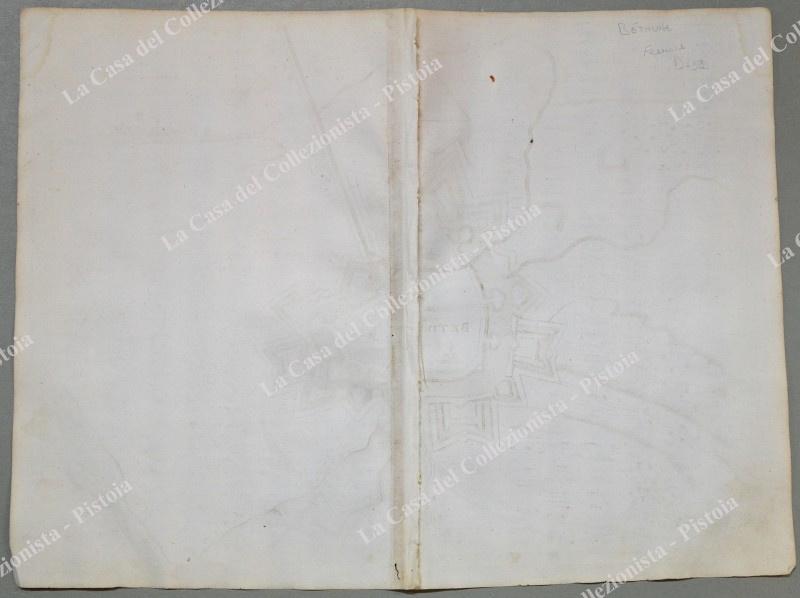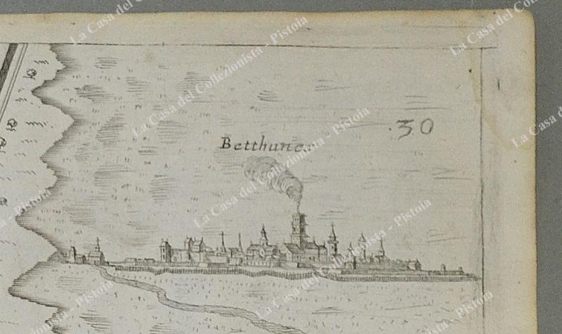 Pianta topografica della città di "Betthunes". Incisione realizzata con la tecnica dell'acquaforte tratta da "Teatro del Belgio o sia descritione delle diecisette provincie del medesimo; Con le Piante delle Città , e Fortezze Principali; da chi al presente possesse; come, in qual modo, & in qual tempo acquistate. Aggiontovi un Succinto racconto di quanto è occorso dalla mossa d'armi del Re Christianissimo contro gli Stati Generali delle Provincie Unite fin' al fine del 1672. Descritta dal Conte Galeazzo Gualdo Priorato", opera stampata in Francoforte nel 1683. Misura cm 41,6x31 (ai margini cm 45,2x33,6). Alla parte inferiore della carta è presente una brunitura lungo la piegatura e due segnetti di tarlo al margine bianco (che non interessano la parte incisa). (Rif.D6995)