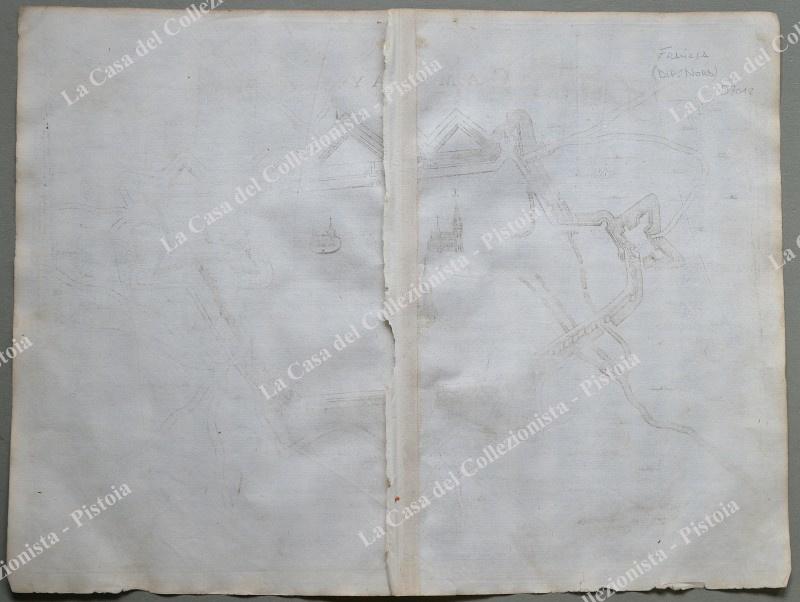 Pianta topografica della città di "Cambray". Incisione realizzata con la tecnica dell'acquaforte tratta da "Teatro del Belgio o sia descritione delle diecisette provincie del medesimo; Con le Piante delle Città, e Fortezze Principali; da chi al presente possesse; come, in qual modo, & in qual tempo acquistate. Aggiontovi un Succinto racconto di quanto è occorso dalla mossa d'armi del Re Christianissimo contro gli Stati Generali delle Provincie Unite fin' al fine del 1672. Descritta dal Conte Galeazzo Gualdo Priorato", opera stampata in Francoforte nel 1683. Misura cm 41,7x30,6 (ai margini cm 44,7x33,6). Macchie d'inchiostro marrone al lato superiore della carta, che interessano sia la parte incisa, sia il margine bianco. Qualche leggero ingiallimento. Vedi foto. (Rif.D7012)