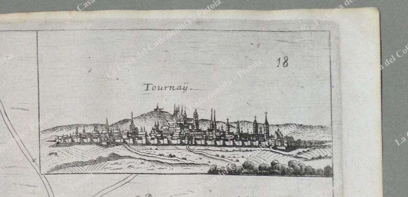 Pianta topografica della città di "Tournay". Incisione realizzata con la tecnica dell'acquaforte tratta da "Teatro del Belgio o sia descritione delle diecisette provincie del medesimo; Con le Piante delle Città , e Fortezze Principali; da chi al presente possesse; come, in qual modo, & in qual tempo acquistate. Aggiontovi un Succinto racconto di quanto è occorso dalla mossa d'armi del Re Christianissimo contro gli Stati Generali delle Provincie Unite fin' al fine del 1672. Descritta dal Conte Galeazzo Gualdo Priorato", opera stampata in Francoforte nel 1683. Misura cm 40x29,8 (ai margini cm 45,7x33,6). Qualche leggero ingiallimento. (Rif.D6985)