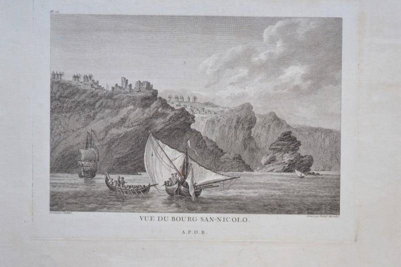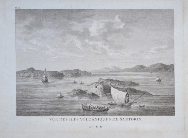 ISOLA DI SANTORINI, GRECIA, GREECE. "VUE DES ILES VULCANIQUES DE SANTORIN" - "VUE DU BOURG SAN- NICOLO". Incisioni all'acquaforte tratte da "VOYAGE PITTORESQUE DE LA GRECE" di