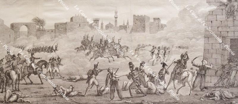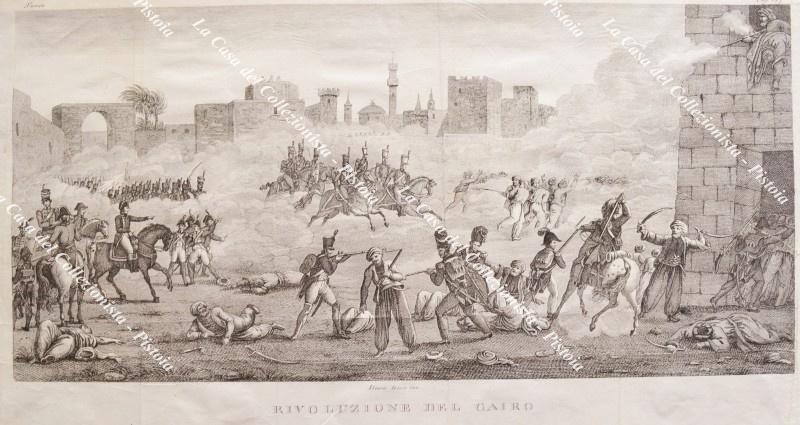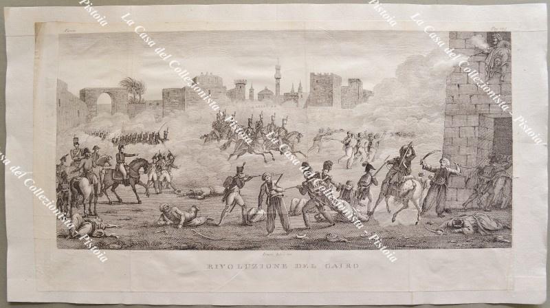 NAPOLEONE. Egitto. "Rivoluzione del Cairo". Grande incisione all'acquaforte tratta dall'opera di De Norvins, circa 1840. Mm 415x218 (ai margini mm 445x245). Ripiegata perchè contenuta in libro come tavola fuori testo. Montata in passepartout in carta d'epoca. Un rinforzo di carta a retro. (Rif.F6430)