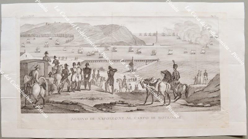 NAPOLEONE. Francia. "ARRIVO DI NAPOLEONE AL CAMPO DI BOULOGNE". Grande incisione all'acquaforte tratta dall'opera di De Norvins, circa 1840. Mm 405x192 (ai margini mm 430x235). Ripiegata perchè contenuta in libro come tavola fuori testo. Montata in passepartout in carta d'epoca. Strappo ricomposto al margine sinistro. (Rif.F6427)