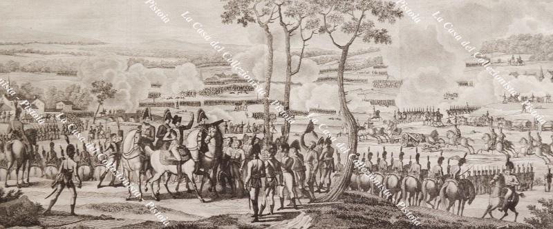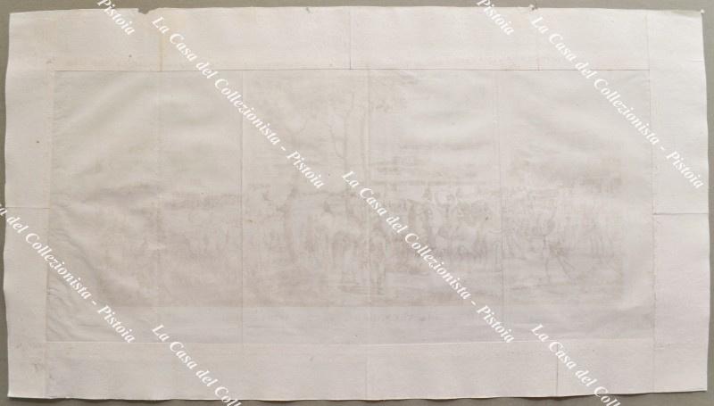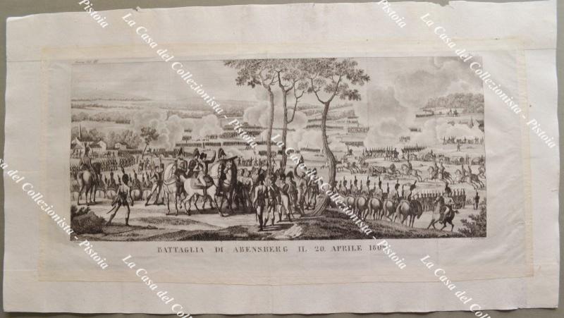 NAPOLEONE. Germania. "BATTAGLIA DI ABENSBERG IL 20 APRILE 1809". Grande incisione all'acquaforte tratta dall'opera di De Norvins, circa 1840. Misura mm 370x160 (ai margini mm 440x215). Ripiegata perchè contenuta in un libro come tavola fuori testo. Montata in passepartout in carta dell'epoca. Buona conservazione. (Rif.F6437)
