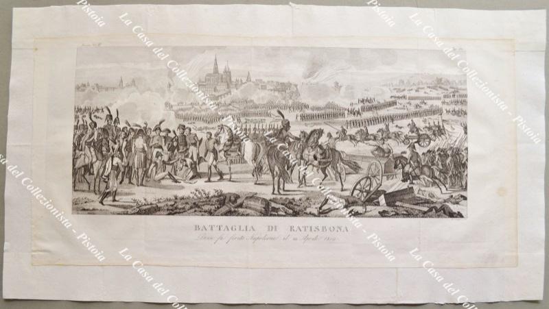 NAPOLEONE. Germania. "BATTAGLIA DI RATISBONA". Grande incisione all'acquaforte tratta dall'opera di De Norvins, circa 1840. Misura mm 360x155 (ai margini mm 445x210). Ripiegata perchè contenuta in un libro come tavola fuori testo. Montata in passepartout in carta dell'epoca. Buona conservazione. (Rif.F6438)