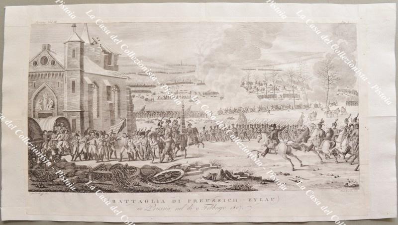 NAPOLEONE. Prussia."BATTAGLIA DI PREUSSICH - EYLAU". Grande incisione all'acquaforte tratta dall'opera di De Norvins, circa 1840. Mm 418x210 (ai margini mm 430x250). Ripiegata perchè contenuta in libro come tavola fuori testo. Montata in passepartout in carta d'epoca. A retro piccolo rinforzo lungo la piegatura. (Rif.F6435)
