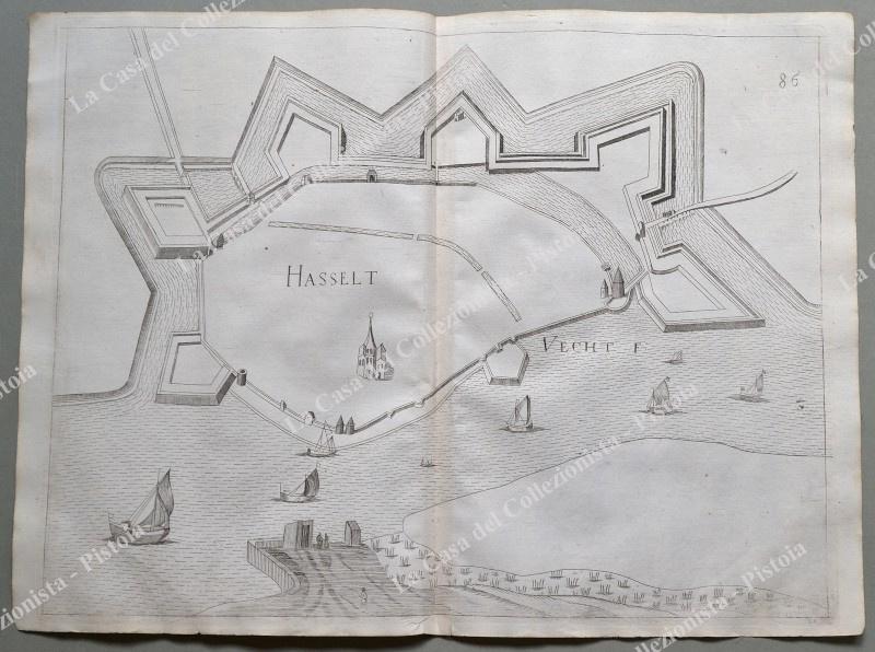 Pianta topografica della città di "Hasselt". Incisione realizzata con la tecnica dell'acquaforte tratta da "Teatro del Belgio o sia descritione delle diecisette provincie del medesimo; Con le Piante delle Città, e Fortezze Principali; da chi al presente possesse; come, in qual modo, & in qual tempo acquistate. Aggiontovi un Succinto racconto di quanto è occorso dalla mossa d'armi del Re Christianissimo contro gli Stati Generali delle Provincie Unite fin' al fine del 1672. Descritta dal Conte Galeazzo Gualdo Priorato", opera stampata in Francoforte nel 1683. Misura cm 41,7x31,9 (ai margini cm 45,4x33,6). (Rif.D7049)