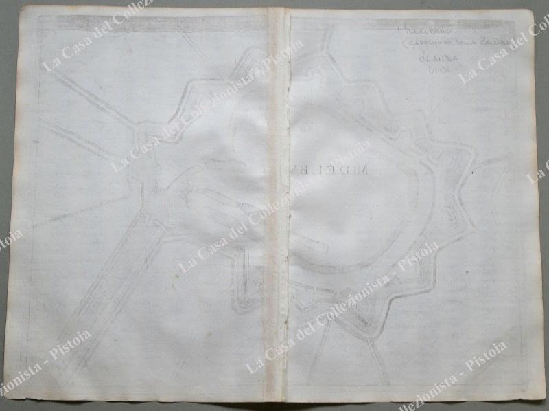 Pianta topografica della città di "Midelburg". Incisione realizzata con la tecnica dell'acquaforte tratta da "Teatro del Belgio o sia descritione delle diecisette provincie del medesimo; Con le Piante delle Città, e Fortezze Principali; da chi al presente possesse; come, in qual modo, & in qual tempo acquistate. Aggiontovi un Succinto racconto di quanto è occorso dalla mossa d'armi del Re Christianissimo contro gli Stati Generali delle Provincie Unite fin' al fine del 1672. Descritta dal Conte Galeazzo Gualdo Priorato", opera stampata in Francoforte nel 1683. Misura cm 41,5x31 (ai margini cm 45x33,7). Lievi ingiallimenti. (Rif.D7036)