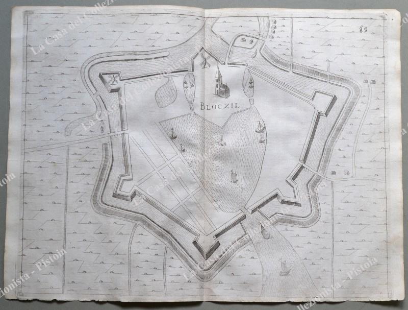 Pianta topografica della città di "Bloczil". Incisione realizzata con la tecnica dell'acquaforte tratta da "Teatro del Belgio o sia descritione delle diecisette provincie del medesimo; Con le Piante delle Città, e Fortezze Principali; da chi al presente possesse; come, in qual modo, & in qual tempo acquistate. Aggiontovi un Succinto racconto di quanto è occorso dalla mossa d'armi del Re Christianissimo contro gli Stati Generali delle Provincie Unite fin' al fine del 1672. Descritta dal Conte Galeazzo Gualdo Priorato", opera stampata in Francoforte nel 1683. Misura cm 41,6x32 (ai margini cm 45,6x33,6). Il margine bianco inferiore presnta alcune imperfezoni. (Rif.D7052)