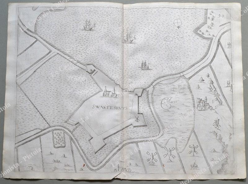 Pianta topografica della città di "Swartesluys". Incisione realizzata con la tecnica dell'acquaforte tratta da "Teatro del Belgio o sia descritione delle diecisette provincie del medesimo; Con le Piante delle Città, e Fortezze Principali; da chi al presente possesse; come, in qual modo, & in qual tempo acquistate. Aggiontovi un Succinto racconto di quanto è occorso dalla mossa d'armi del Re Christianissimo contro gli Stati Generali delle Provincie Unite fin' al fine del 1672. Descritta dal Conte Galeazzo Gualdo Priorato", opera stampata in Francoforte nel 1683. Misura cm 41x31,5 (ai margini cm 45,6x33,6). E' presente una piega nella parte inferiore centrale, una piccola mancanza di carta al lato inferiore sinistro e una macchiolina al lato inferiore destro. (Rif.D7053)