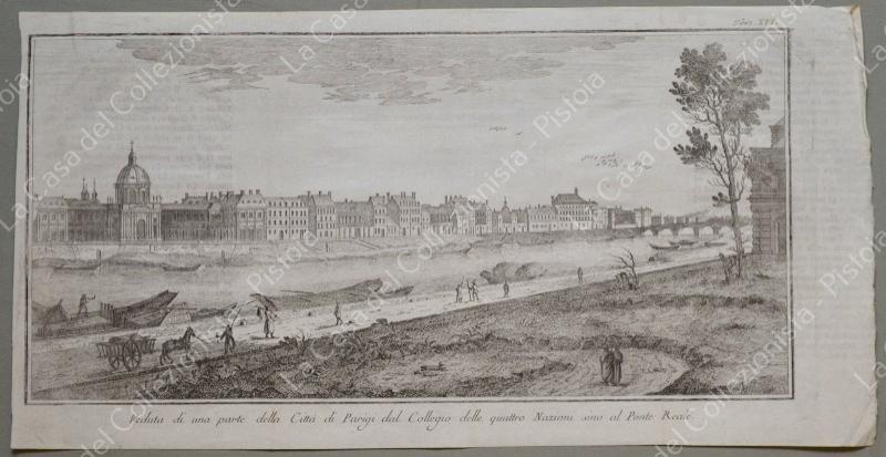 PARIGI. Veduta di parte della Città di Parigi dal Collegio delle Quattro Nazioni sino al Ponte Reale. Acquaforte di mm 320x155 più margini. Tratta dall'opera di Salmon, edizione di Venezia, circa 1750. Ripiegata (proviene da libro). Buona conservazione. (Rif.F6292)