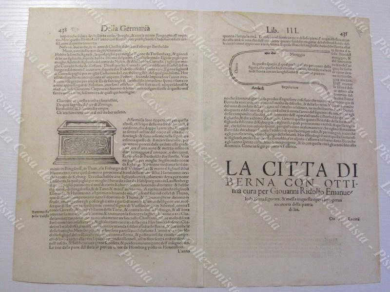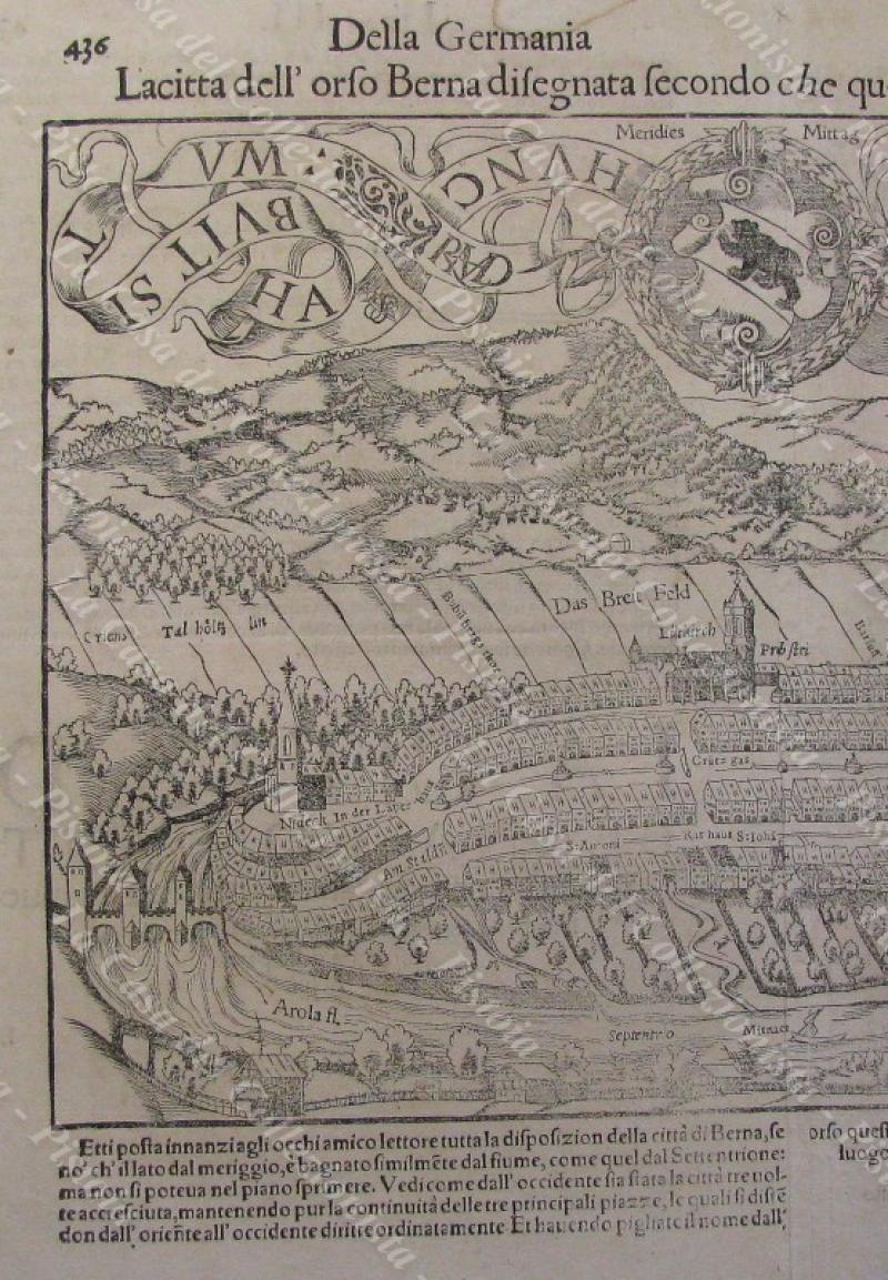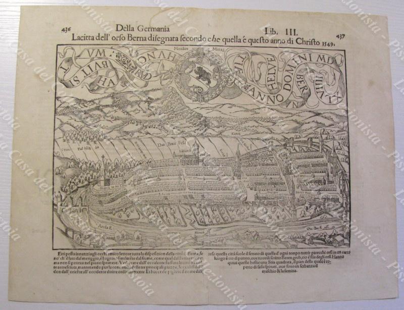 SVIZZERA, BERNA. “La città dell’Orso Berna disegnata secondo che quella è questo anno di Christo 1549”, Sebastian Munster, circa 1590. Xilografia di mm 300x210 (ai margini 395x305). Testo in italiano. Buona conservazione. (Rif.F0158-562/73)
