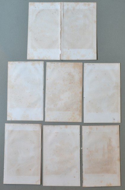 LAZIO - TIVOLI. Insieme di 7 vedute incise su rame tratte da "Lettres sur l'Italie" di L. Castellan, Parigi 1819: 1) "Vue de Tivoli", veduta a doppia pagina di mm 214x138 più margini. 2) "Ponte Lupo", veduta panoramica di mm 105x139 più margini. 3) "Site de la Maison d'Horace", panorama di mm 105x142 più margini. 4) "Cascatelles", veduta generale di mm 107x142 più margini. 5) "Grotte des Sirenes", mm 106x150 più margini. 6) "Temples de Vesta et de la Sybille", bel panorama di mm 107x138 più margini. 7) "Villa d'Est", panorama di mm 104x137 più margini. Buona conservazione. (Rif.B8300-381/61)