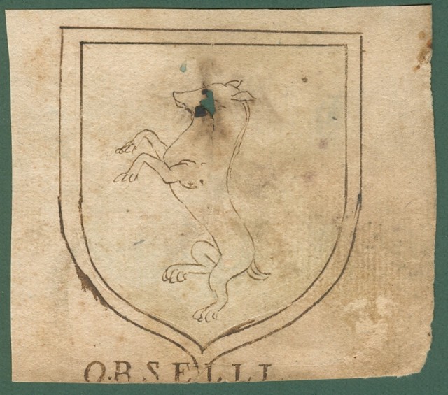 ARALDICA. ORSI-ORSELLI. Toscana '600. Stemmi di famiglie nobili toscane realizzati a china e tempera, databili alla seconda metà del 1600. Parte di foglio contenente (uno al recto ed uno al verso) i due stemmi ciascuno di mm 60x80 più margini. Piccola mancanza centrale, che interessa la coloritura dello stemma al recto(l'altro non ha coloritura). Il margine che reca i cognomi è stato leggermente rifilato. (Rif.C5136)