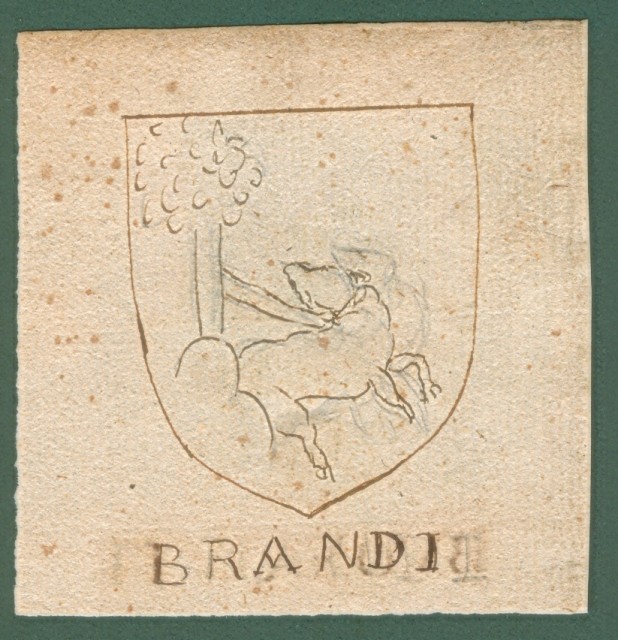 ARALDICA. BUONAIUTI-BRANDI. Toscana '600. Stemmi di famiglie nobili toscane realizzati a china e tempera, databili alla seconda metà del 1600. Parte di foglio contenente (uno al recto ed uno al verso) i due stemmi ciascuno di mm 60x80 più margini. Uno stemma non ha coloritura. Buona conservazione. (Rif.C5132)