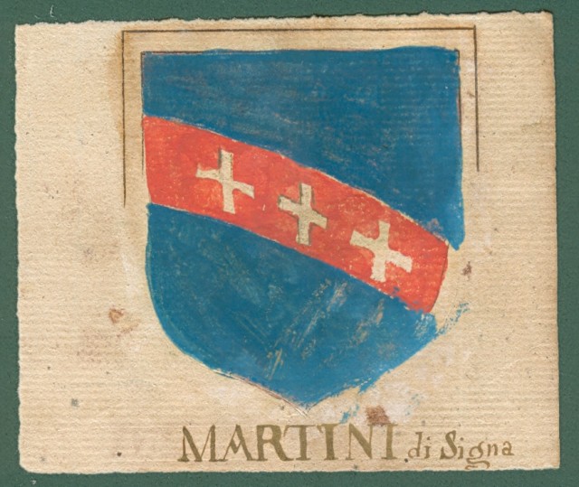 ARALDICA. MARTELLINI-MARTINI di Signa. Toscana '600. Stemmi di famiglie nobili toscane realizzati a china e tempera, databili alla seconda metà del 1600. Parte di foglio contenente (uno al recto ed uno al verso) i due stemmi ciascuno di mm 60x80 più margini. Buona conservazione. (Rif.C5124)