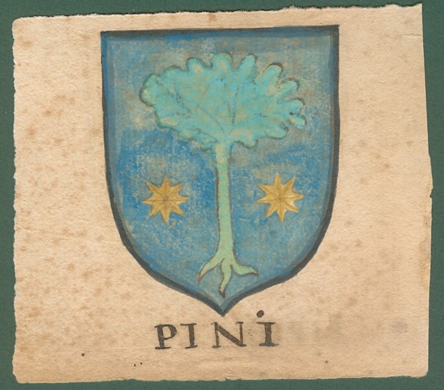 ARALDICA. Dal PONTE-PINI. Toscana '600. Stemmi di famiglie nobili toscane realizzati a china e tempera, databili alla seconda metà del 1600. Parte di foglio contenente (uno al recto ed uno al verso) i due stemmi ciascuno di mm 60x80 più margini. Buona conservazione. (Rif.C5120)