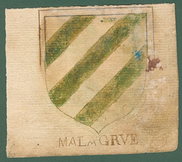 ARALDICA. MENICHINI-MALAGRVE. Toscana '600. Stemmi di famiglie nobili toscane realizzati a china e tempera, databili alla seconda metà del 1600. Parte di foglio contenente (uno al recto ed uno al verso) i due stemmi ciascuno di mm 60x80 più margini. Coloritura sbiadita. (Rif.C5112)
