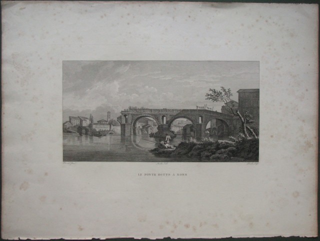 ROMA. 'LE PONTE ROTTO A ROME'. Bella decorativa incisione su rame di Daudet da un dipinto di Vernet. Mm 375x195 (ai margini 600x450). Bella grande e decorativa. Circa 1850. Ottima conservazione, lievi ingiallimenti sui margini. (Rif.C2549-431/58)