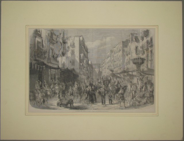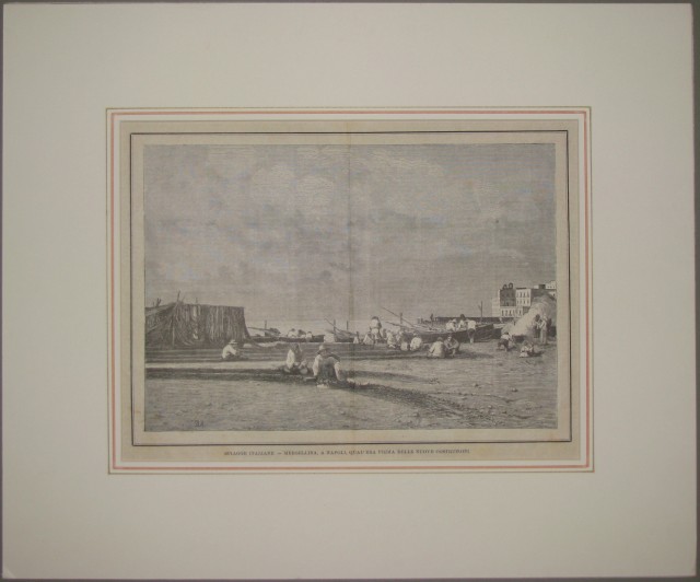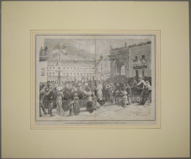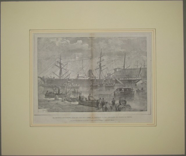 NAPOLI. Insieme di 4 xilografie di vario formato. Trattasi di incisioni nel testo e provengono da riviste della seconda metà dell'800. Montate in passepartout ad alto smusso e decorato: 1)"La Strada del porto a Naples" da L'Illusteration Francais. Anno 1857, cm 40x27 più margini. 2) "Margellina", da Illustrazione Italiana, circa 1875, cm 31x22 più margini. 3) "La seconda spedizione italiana nel Mar Rosso. Il Vincenzo Florio ancorato nel porto di Napoli", da l'Illustrazione Popolare, circa 1880, cm 30x20 più margini. 4) "Accoglienza entusiastica fatta ai sovrani a Napoli" da l'Illustrazione Popolare, anno 1875, cm 32x23 più margini. (Rif.C2794)