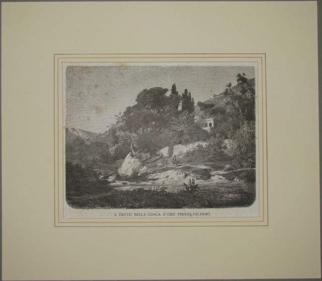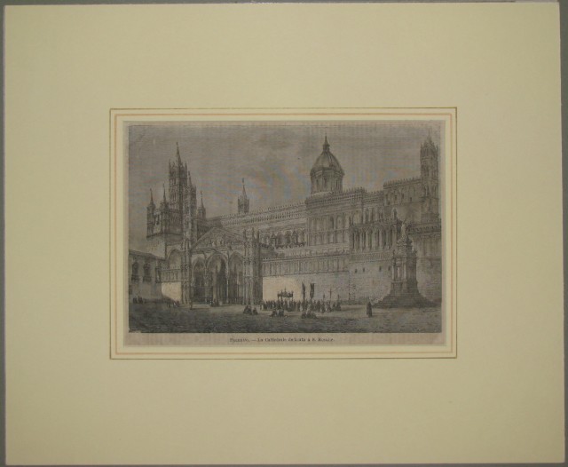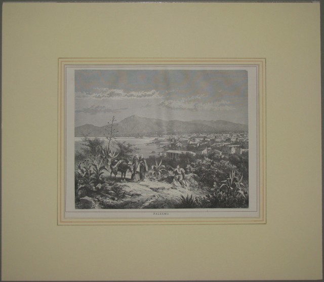 PALERMO. 3 xilografie montate in passepartout ad alto smusso e decorato: 1) "A Oreto nella Conca d'Ora presso Palermo". Da "Dalle Alpi all'Etna", anno 1875. Ai margini cm 37x27. 2) "Palermo". Veduta generale. Tratta da "Dalle Alpi all'Etna". Anno 1875. Ai margini cm 27x37. 3) "La Cattedrale dedicata a S. Rosalia". Tratta da "L'Illustrazione popolare". Anno 1870. Cm 23x16,5 più margini. (Rif.C2793)