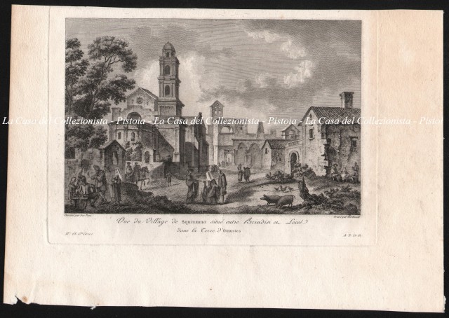 PUGLIA - SQUINZANO. "Vue du Village de Squinzano situeà© entre Brindisi et Lecce dans la Terre d'Otrantes", veduta presa all'interno del paese animata da molti pesonaggi. Acquaforte, mm 220x145 (ai marg. 330x223). Da Saint-Non, prima edizione anno 1781. Buona conservazione. (Rif.B7093-419/54)