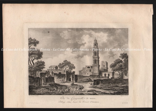 PUGLIA - SOLETTA. "Vue du Campanille de Soletta, Village situeè dans la Terre d'Otrantes". Bella veduta panoramica del borgo con alcuni contadini e animali in primo piano. Decorativa. Mm 218x147 (ai margini mm 320x235). Da Saint-Non, prima edizione anno 1781. (Rif.B7095-418/54)