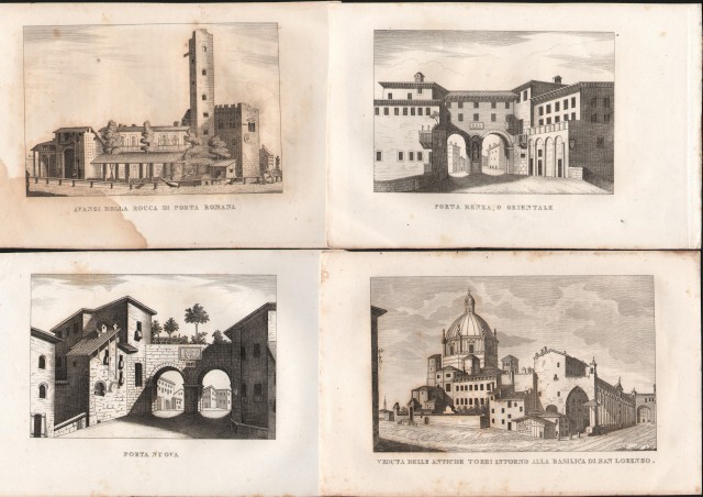 Milano. Insieme di 4 tavole (ai margini mm 125x145) raffiguranti Porta Nuova, Basilica di S. Lorenzo e antiche torri, Avanzi della Rocca a Porta Romana, Porta Renza o Orientale.