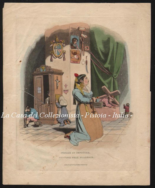 (Toscana) FIRENZE. "Female at devotion. Costume near Florence". Giovane donna in preghiera. Mm 220x270. Bellissima tavola disegnata da Richard Bridgens, incisa in rame e finemente colorata a mano all'epoca. L'artista raffigura costumi e mestieri tipici del primo '800 ambientandoli in piacevoli scene di gusto locale. Tratta dall'opera "Sketches Illustrative of the Manners and Costumes of France, Switzerland, and Italy" edita a Londra nel 1821. Vecchi timbrini d'appartenenza sul retro. Buona conservazione. (Rif.B6983-201/54 - Toscana)