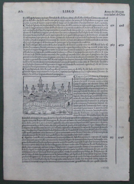 CAMPANIA - CAPUA. "Capua citta in Campagna". Veduta generale. Xilografia di mm 82x63 contenuta in intera pagina originale di mm 210x302. Dall'opera di Jacopo Foresti detto il Bergomensis, edizione del 1535. Ottima conservazione. (Rif.B2279-299/50)