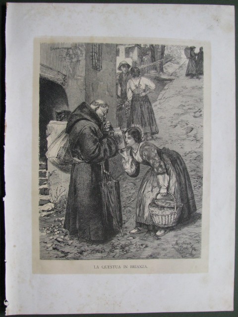 BRIANZA, 'La questua in Brianza'. Una giovane popolana s'inginocchia innanzi a un frate. Xilografia di mm 188x250 (ai marg. 270x360). Xilografia fuori testo tratta da "Dalle Alpi all'Etna", circa 1880. (Rif.B1267-531/49)