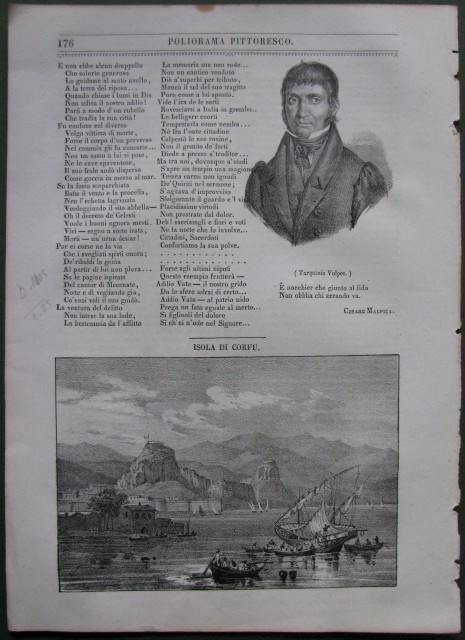 CORFU', bel panorama generale con barche in primo piano. Mm 157x108 più marg.. Anno 1837. Incisione tratta dal Poliorama Pittoresco, periodico illustrato edito in Napoli a partire dal 1836. E' contenuta intercalata nel testo ed incisa in modo assai fine in litografia. Veramente bella e decorativa. Viene presentata in passepartout spesso e decorato. (Rif.B1105-373/49)