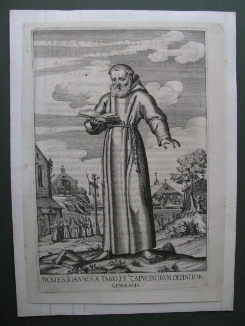 FANO (Ancona), "Frater Ioannes a Fano FF.m Capucinorum Definitor Generalis". Raffigurato con un libro in mano (altri ai suoi piedi). Sullo sfondo alcune scene d. sua vita. Mm 193x279 (ai margini mm 228x323). Tratta dall'opera Flores Seraphici edita a Colonia (due edizioni: 1640 e 1642); le incisioni dell'opera sono state realizzate dai maestri fiamminghi Johann Heinrich e Johann Eckhard Loffler. Ottima conservazione. (Rif.B023-284/48)