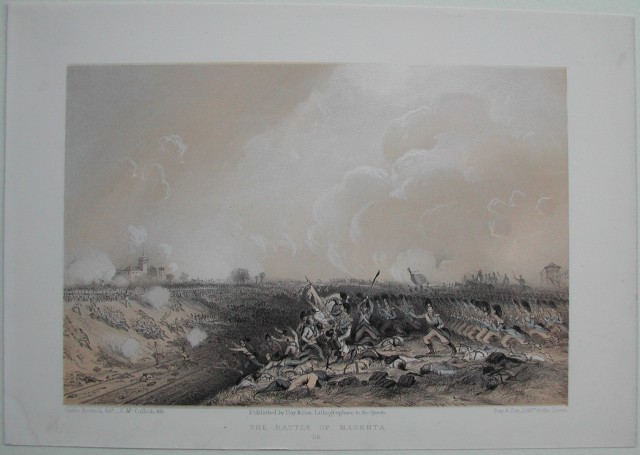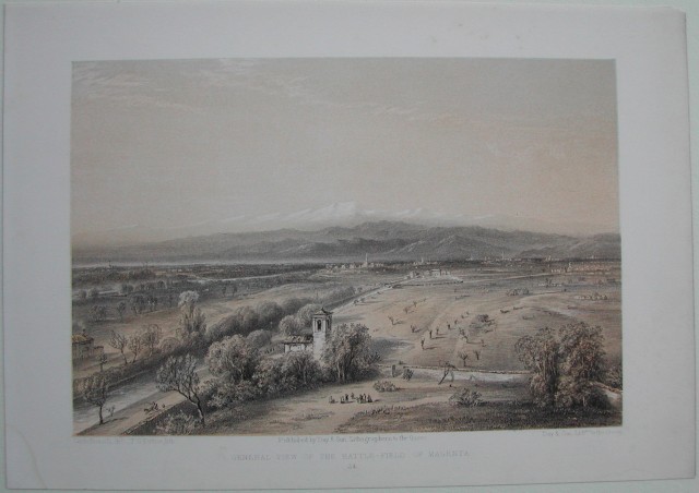 LOMBARDIA ' MAGENTA. Due splendide litografie realizzate nei toni del seppia e del nero raffiguranti il teatro della famosa battaglia: 1'°) In primo piano una chiesa ed un corso d'acqua, sullo sfondo alcuni paesi e le Alpi. Molto decorativa. 2'°) In primo piano moltissimi soldati, sullo sfondo alcuni fabbricati. Molto decorativa. Tratte dall'opera di Carlo Bossoli edita nel 1859. Ciascuna misura mm 225x155 più margini. (Rif.A8423-334/47)