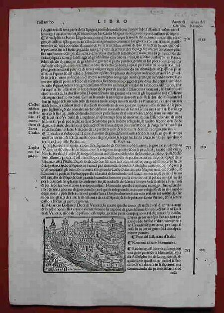 Veduta generale. Xilografia di mm 85x57, contenuta nellintera pagina dorigine di mm 210x310. Tratta da Supplementum supplementi chronicarum opera di Jacopo Filippo Foresti, detto il Bergomensis, edita in Venezia nel 1535. (Rif.A852-55/39 - Ravenna)