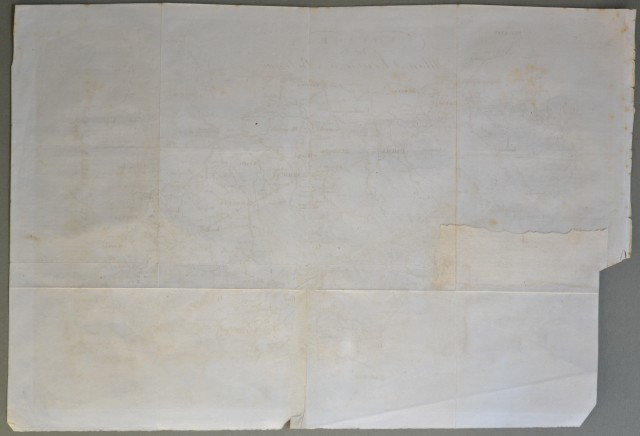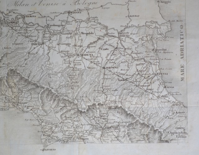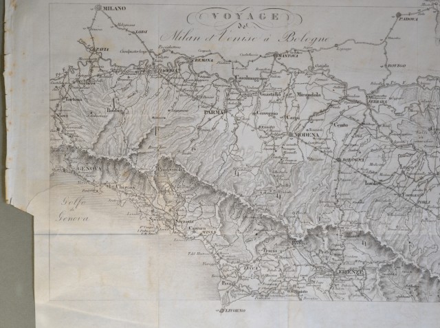 LOMBARDIA - EMILIA - VENETO. Viaggio da Milano e Venezia a Bologna. Carta di mm 305x200 più margini, comprendente parte del Piemonte, parte della Lombardia, l'Emilia e Romagna, la parte orientale della Liguria e parte della Toscana. Strappetto laterale ricomposto. (Rif.A833-402/61)